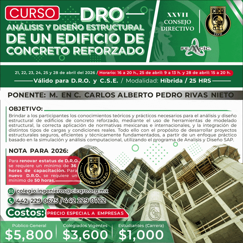 El Colegio de Ingenieros Civiles del Estado de Querétaro, A.C. y el XXVII Consejo Directivo invitan a sus agremiados y profesionales del sector a participar en este curso especializado.